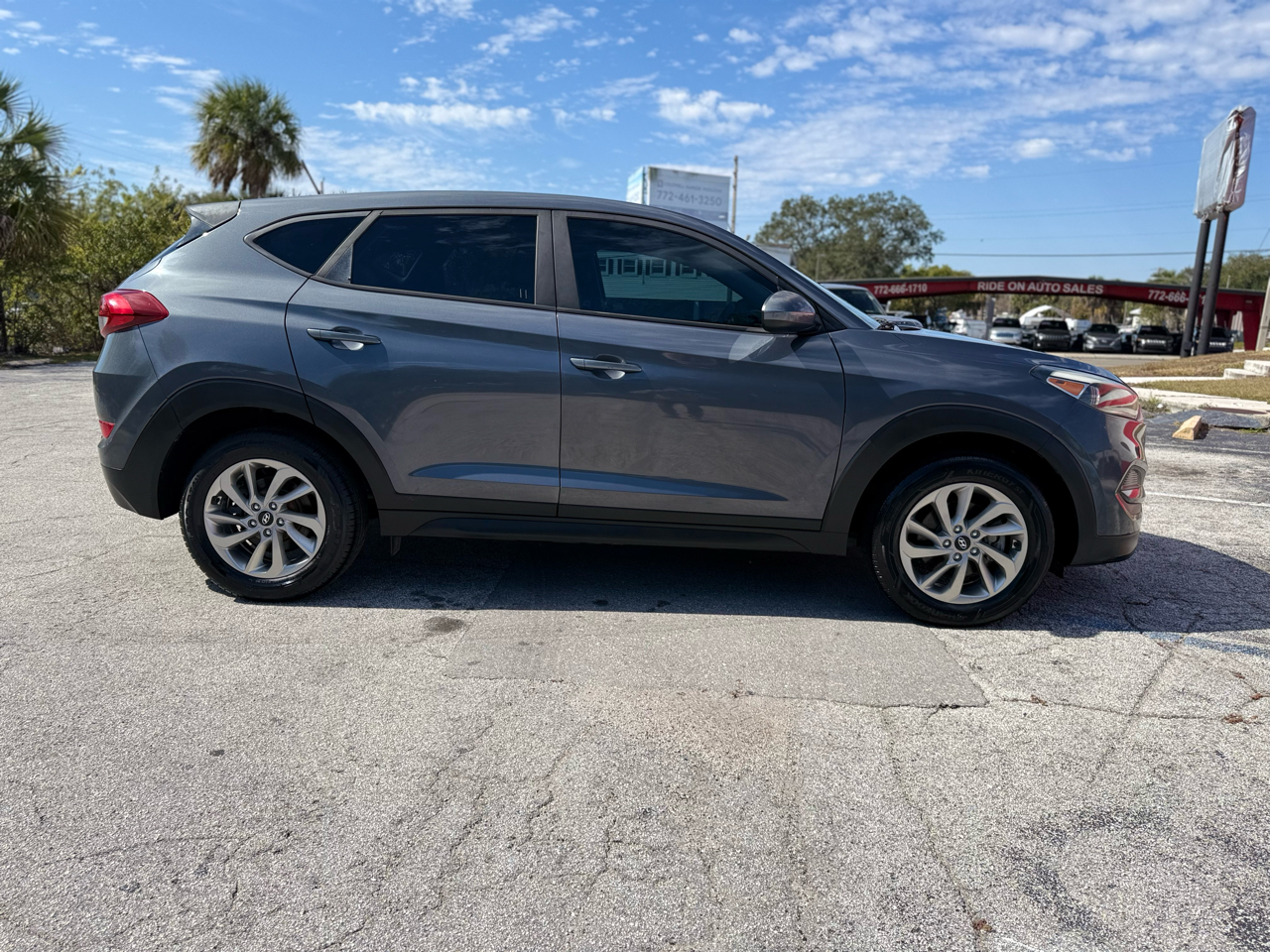 Get ready to hit the road in style with this sleek Gray 2017 Hyundai Tucson! Loaded with safety features like child safety door locks, ABS brakes, and multiple airbags, you can drive with peace of mind knowing you and your passengers are protected. Enjoy the convenience of power door locks, keyless entry, and steering wheel mounted controls as you cruise down the highway. Keep track of your journey with the trip computer and tachometer, while the adjustable foot pedals ensure the perfect fit for drivers of all sizes. With alloy wheels, a rear spoiler, and cargo area tiedowns, this Hyundai Tucson is both practical and sporty. And the best part? A Carfax report is available for this car, so you can buy with confidence. Don't miss out on the opportunity to make this feature-packed, reliable pre-owned Hyundai Tucson yours today!Visit Ride On Auto Sales to shop our great deals. You can contact us or call 772-666-1710 to schedule your test drive today.